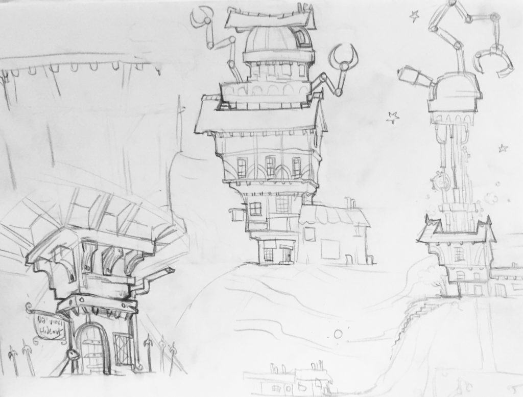 Here's a great piece of concept art drawn by Francis sketching a bunch of ideas for Larry Da Vinci's Hideout. As with Larry's character, you can see that the design takes a lot of inspiration from Leonardo Da Vinci's inventions and his technical drawings. It's really cool!